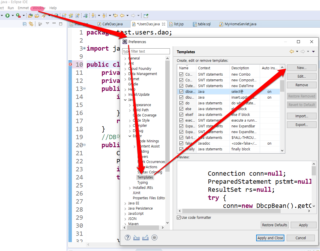 DBupdate와 DBselect가 DAO만드는 과정에서 반복적으로 등장하여 미리 템플릿을 만들어 사용해주었다.