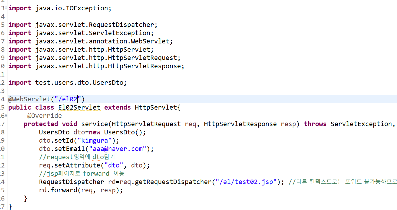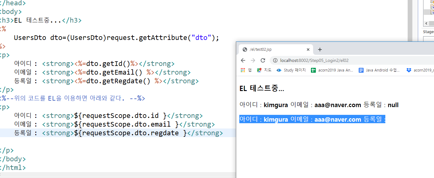 id와 email만 set해놓은 위와 같은 서블릿을 아래의 jsp페이지로 포워드 이동시켰다.
