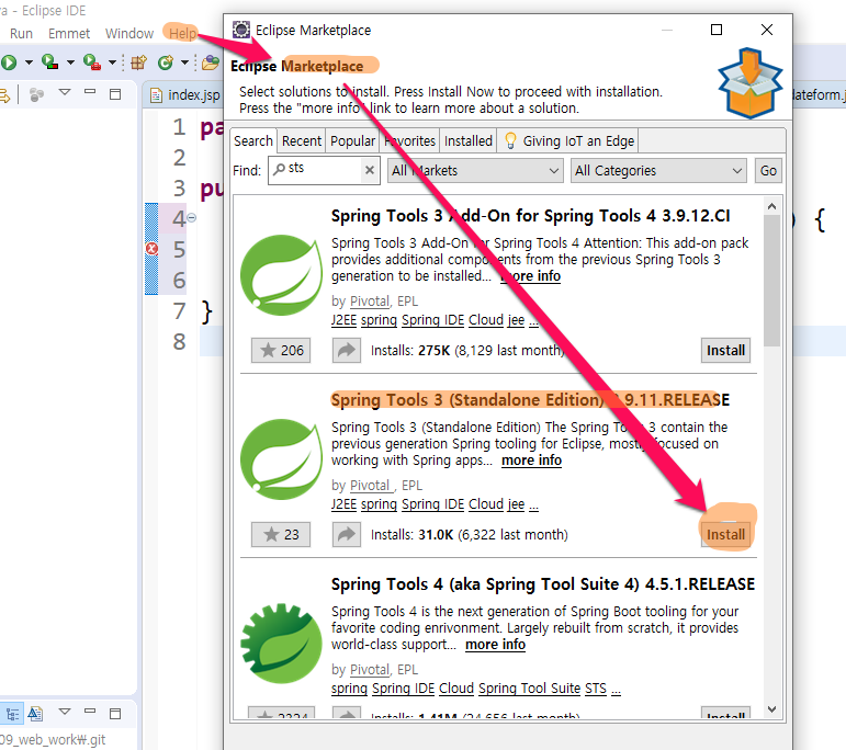 8. help -> eclipse marketplace -> spring tool3 인스톨 후 설치가 다 되면 리스타트한다.