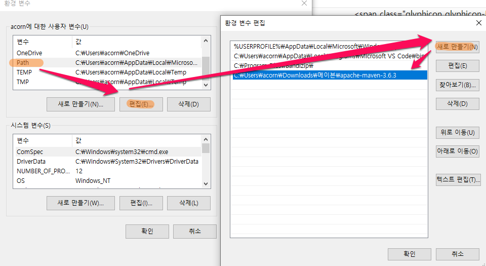 4. Path 편집에서 새로만들기해서 bin 폴더의 주소를 붙여넣기한다. (위의 사진에는 bin이 빠져있다.)