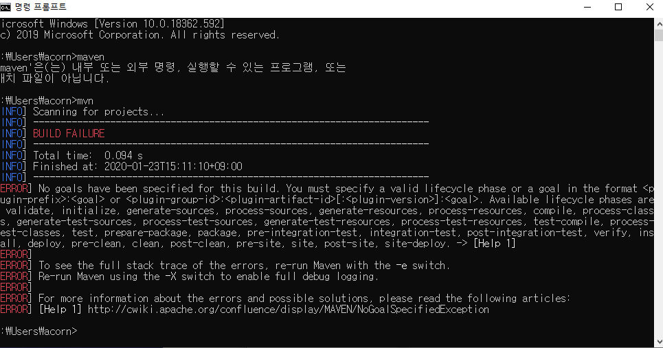 5. cmd에서 mvn을 입력해서 위와같이 출력되면 잘 설치된것이다.