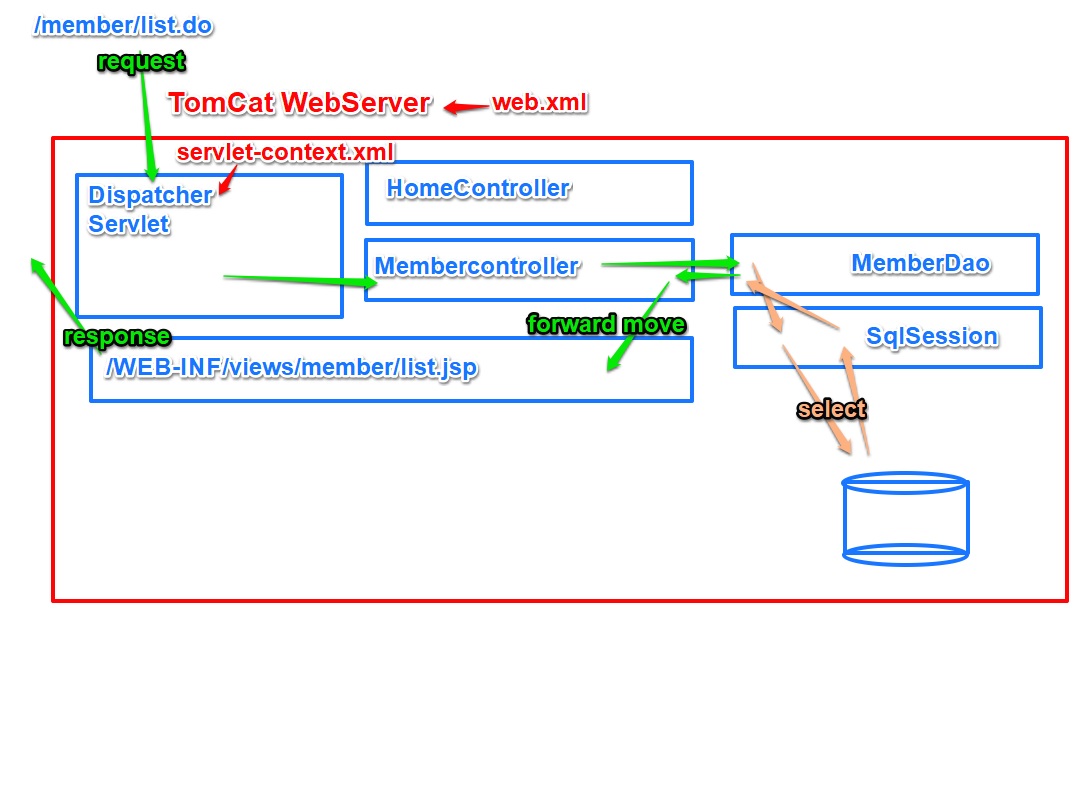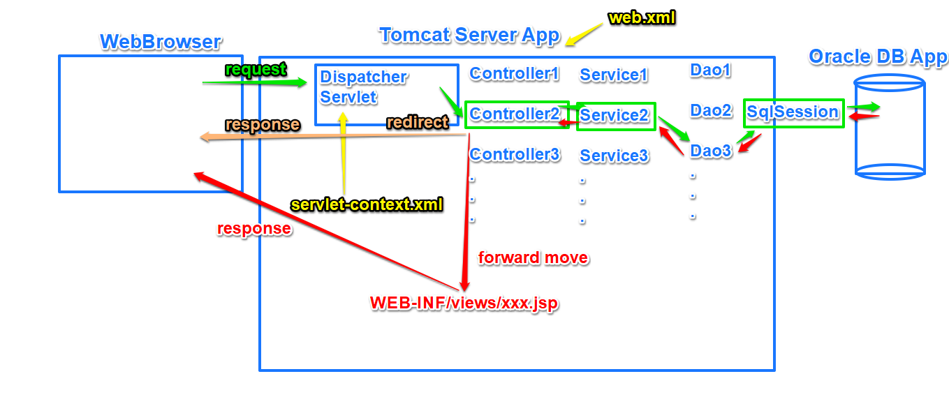Contorller : 컨트롤러는 어플리케이션이 제공하는 기능과 사용자 요청을 연결하는 매개체로서 기능제공을 위한 로직 을 직접 수행하지는 않는다. 컨트롤러의 주요 역할은 다음과 같다.