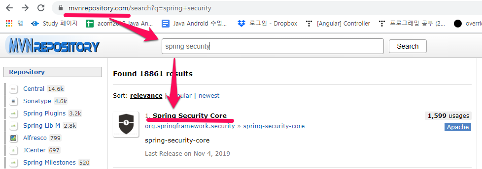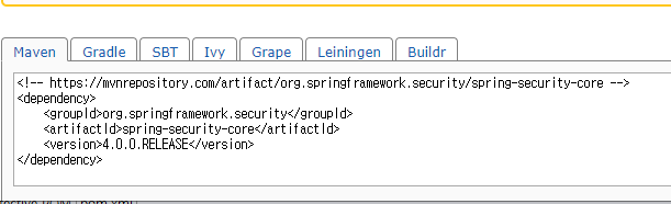 1. mvnrepository.com에 접속해서 spring security 검색 후 Spring Security core를 클릭