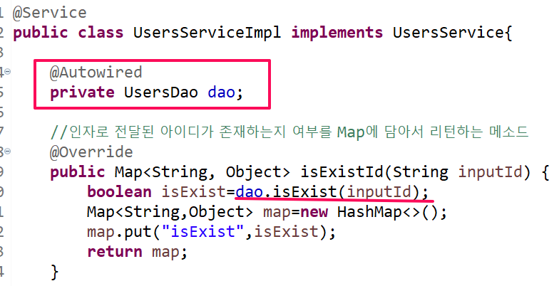 위의 예시는 service에서 @Autowired어노테이션을 통하여 핵심의존객체인 Dao를 주입받는 것을 보여준다. Dao객체를 직접 생성하지 않아도 바로 사용할 수 있다.