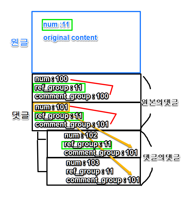 ref_group(댓글 그룹번호)는 원글의 글번호,