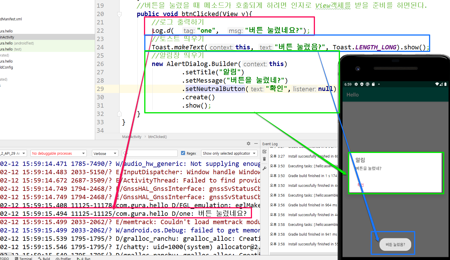 //버튼을 눌렀을 때 메소드가 호출되게 하려면 인자로 View객체를 받을 준비를 하면된다.