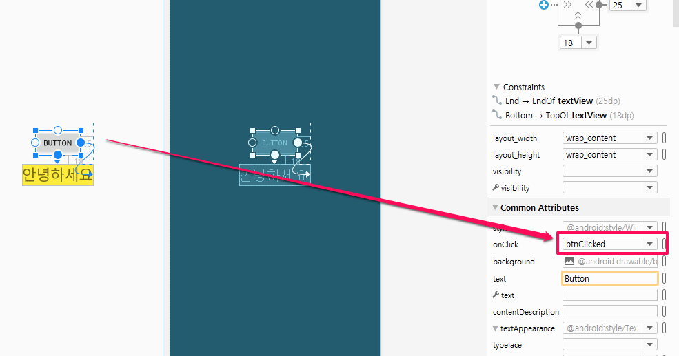button을 눌러서 Common Attributes의 onClick을 btnClicked로 바꾼다.