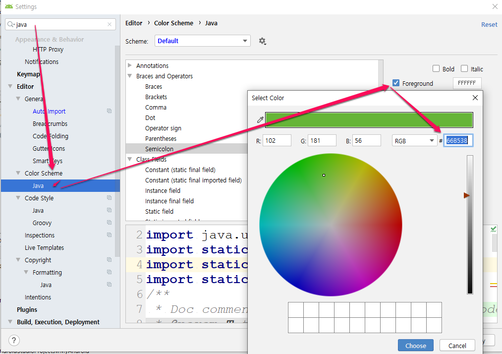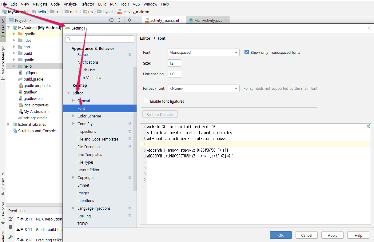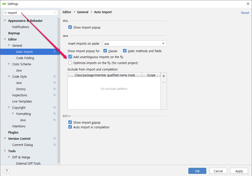 file->settings에서 폰트 및 import설정을 할 수 있다.