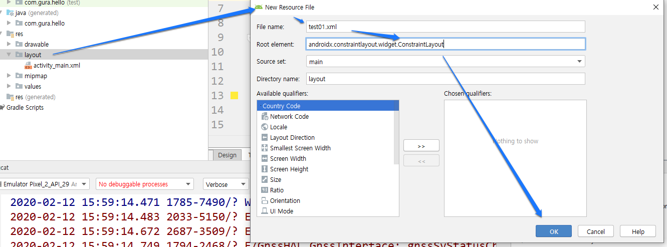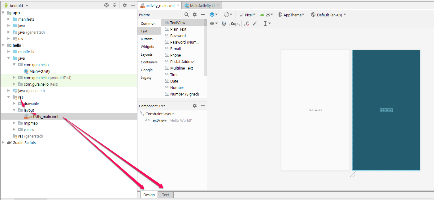 아래에는 layout.xml이있다. : 화면 배치를 하는 곳 ex)버튼의 위치선정