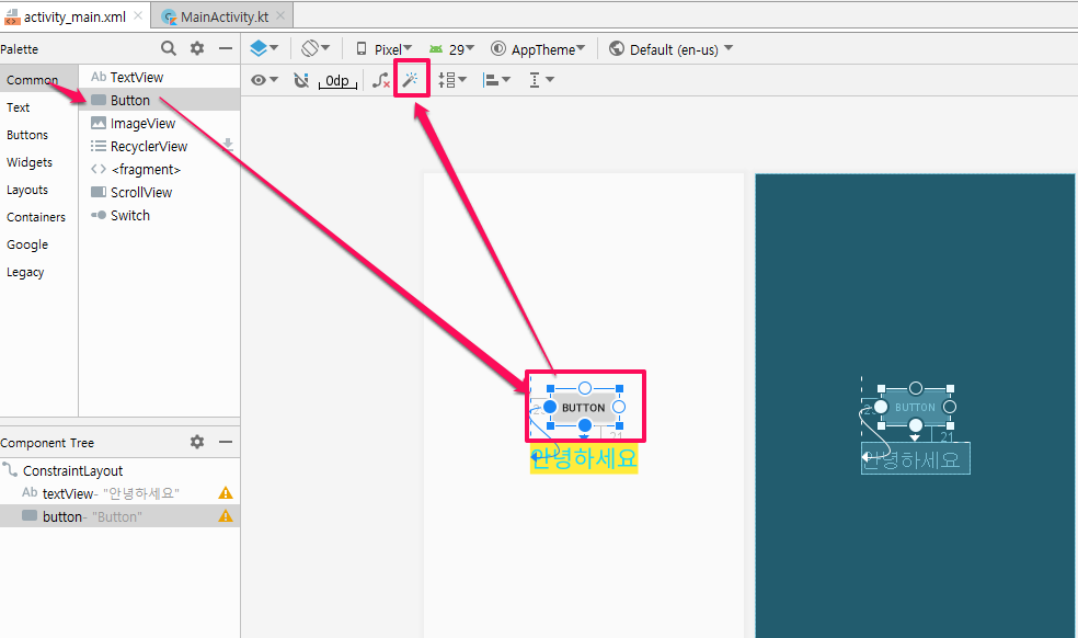 activity_main.xml->common->button->버튼을 드래그해서 원하는 위치에 옮긴 후 요술봉 (Infer constraints)를 누르면 버튼 위치를 지정해 줄 수 있다.