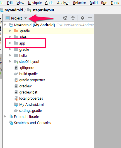 다음과 같이 프로젝트항목에서 app프로젝트가 삭제된 것이 아님을 확인할 수 있다.